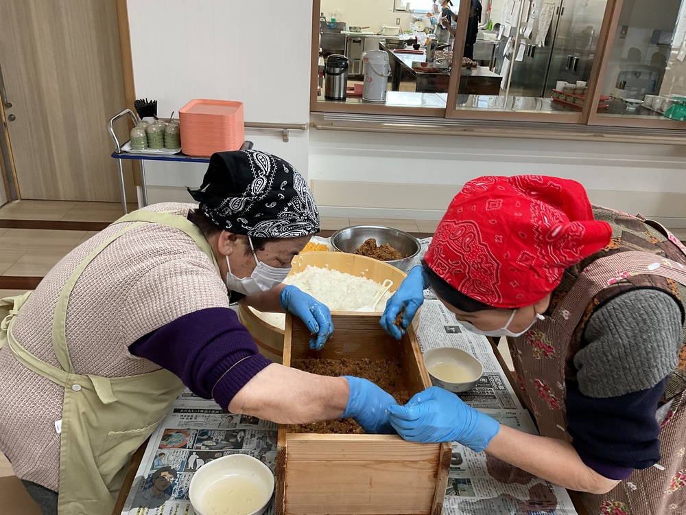 お昼の楽しみ 2024年12月19日 今朝は雪模様。池田でも5センチ積雪があったようです。お昼は箱寿司でした。 寒さに負けず食事を摂って頂けるように、栄養士がメニューを考えています。 お二人の方に、お手伝いして頂き、息の合った熟練の作業です。 最後は美味しくなるように思いを込めて完成です。 誕生日のお祝いをしました。 なじみの方との交流を楽しみに通われておられます。これからもお元気でデイサービスにお越し下さい。