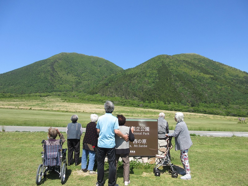 2022年05月18日 大自然の空気を吸って「天気がいいからドライブに出かけたいわ」と皆さん外出を楽しみにされています。本日、天候にも恵まれたため、三瓶の西の原に出かけました!「久しぶりに三瓶の方に来たよ」「なかなか外出をする機会がない」という声も聞かれますが皆さん芝生の上を職員と一緒に、しっかりとした足取りで景色を眺めながら歩かれました。外出支援が皆さんの思い出の1つとなり、沢山の笑顔や気分転換、運動の機会がもうけられるようにこれからも天候の良い日はドライブに出かけていきます!