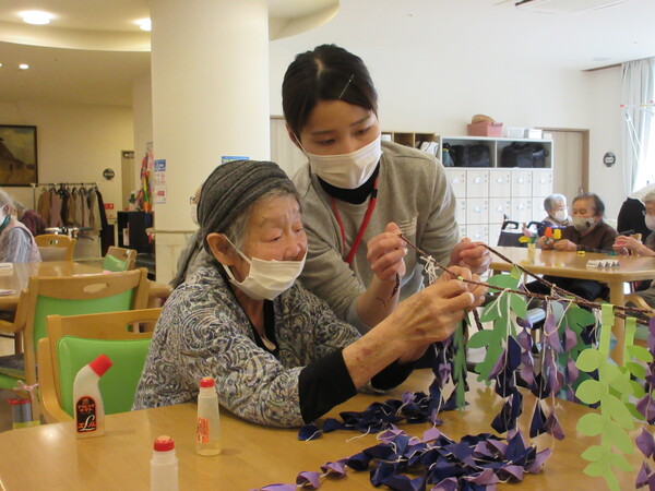 藤の花お披露目まで 2023年04月26日 藤の花が完成に近づいてきました。 今日は、葉をバランスよく枝につけておられました。 「もう少し葉の間隔をあけたほうがバランスがいいかな?」と見栄えを考え葉付けが終わりました。 4月は枝垂れ桜が館内に飾られていましたが、5月は藤の花を見にデイサービスにお越しください!