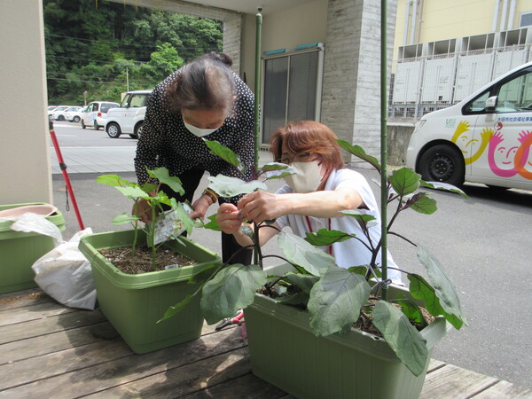喜んでもらいたい! 2023年06月07日 デイサービスの園芸に携わっておられるNさん 「今日は夏野菜のお世話だよ」と順調に育っているナスなどの手入れをして下さいました。 「上手に出来ると職員さんや利用者の皆さんが喜んでくれるからやりがいがあるよ」 と熱心に取り組まれました。 皆さんの役割や興味がある事に職員も一緒に取り組みます! これからも続けて行きましょう。