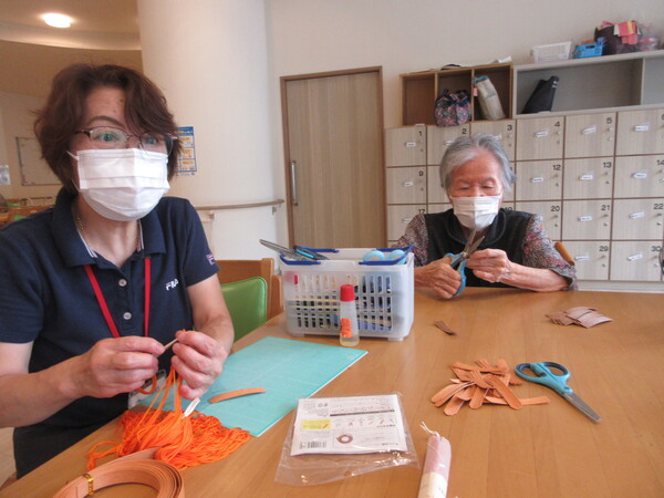 夏の風物詩の準備 2022年07月30日 夏と言えば夏祭り!今年もビラおおだデイサービスセンター納涼祭を開催します 今日で7月も終わりますね。 ビラおおだでは納涼祭へ向け、着々と飾り付けの準備が進んでいます。 「今日は柄の部分を作るんだよ」「千里の道も一歩から!」 とまだまだ全貌は見えませんが、着実に完成に近づいている様です。 「何が出来るかはまだお楽しみだよ」 来週には全貌が見えるでしょうか、完成が楽しみな手芸活動のご様子でした。