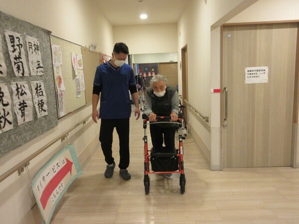 歩くのはいいね 2023年12月18日 寒い日が続いていますが、本日も歩行練習で理学療法士と屋外や屋内を歩いています。 外に出る時は上着を着て防寒対策をしています。 M様は活動量の向上の為 U様は右足がすり足となりやすい為、歩行訓練で修正を図っています。 歩行練習をする中で、「歩くのはいいね、いい運動になる」と話され、「また歩こう」と意欲的な発言もみられました。 これからも天候や体調の変化に合わせて歩行練習を実施していきます。