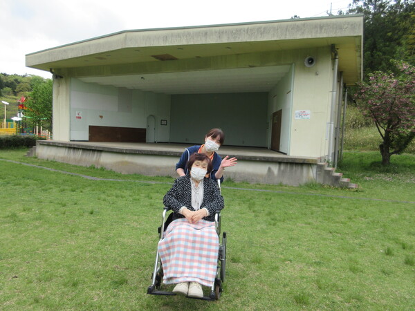 春の行楽弁当旅 2024年04月23日 藤の花が満開な今日この頃。 弁当を片手に野外音楽堂横の広場へ行きました。 「私は花より団子!!」との声が聞こえそうなほど黙々と召し上がられました。 食事の後は、景色を見ながらの談笑タイムです。 遠くを眺めたり 近くまで見に行き、「滑ってみちゃろうか。」 「音が響くなあ~」 と感想はさまざま。 思い思いに楽しみました。 お腹も満腹、大変楽しい行楽旅でした。 また行きましょうね。