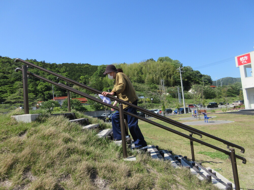 市立病院のリハビリ公園へも出かけ、しっかり階段と平地の歩行を行いました。