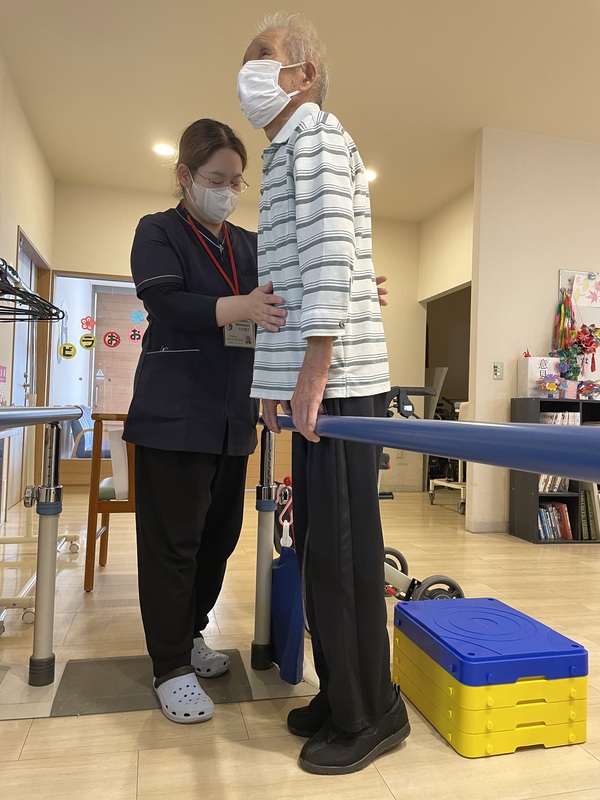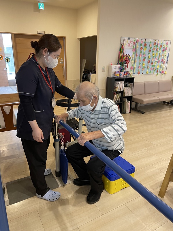 目標に向かって 2024年09月28日 「座って草取りがしたいなぁ」との思いを耳にし 高さが調整できる踏み台を使って、作業療法士が立ち座りの動作を確認しています。 少しずつ筋力をつけて、目標である庭の草取りを出来るように一緒に頑張っていきましょう。
