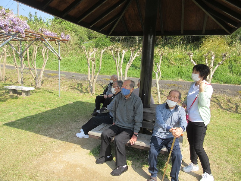 2022年04月22日 男性の皆さんと本日も大田市民公園へ出かけました。メンバーは男性利用者の皆様です。藤の花や八重桜もきれいでしたが、なにより暖かい日差しと心地の良い風を感じて喜んでおられました。「青空が気持ちいいな」「また来たいなぁ」「外で身体を動かすのは気持ちいいなぁ」といったことや昔子供さんと草滑りをした思い出話をして下さいました。今度はつつじを見に出かけましょう、お楽しみに!