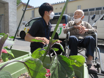 「外の様子が見に行きたい」とプランターで作っている野菜を見ながら職員と談笑。