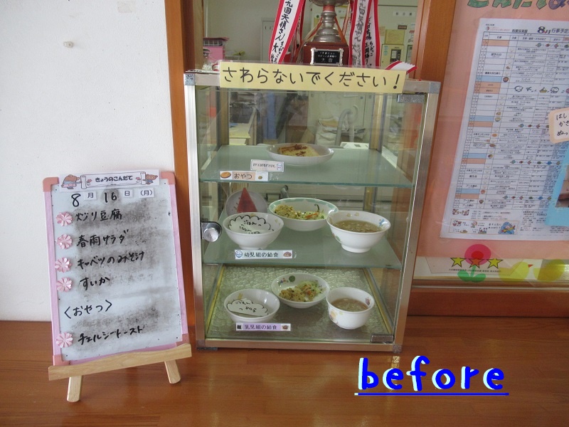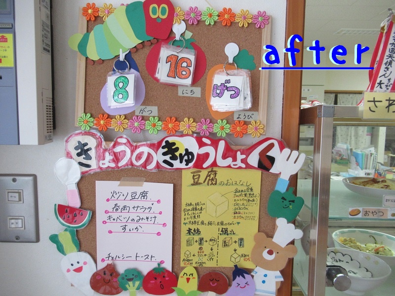 2021年08月16日 サンプルコーナーリニューアル☆(給食室)玄関入口にあるサンプルコーナーをリニューアルしました!!今まではホワイトボードに1日の献立を書いていましたが、これからは可愛くデコレーションしたボードに献立と、給食室からのお知らせや、食べ物の面白さなどを展示していこうと思います。可愛い野菜たちが付いているので子どもたちが「かわいい!」と楽しそうに見ている様子が見られました♪【before】【after】ぜひご覧ください☺