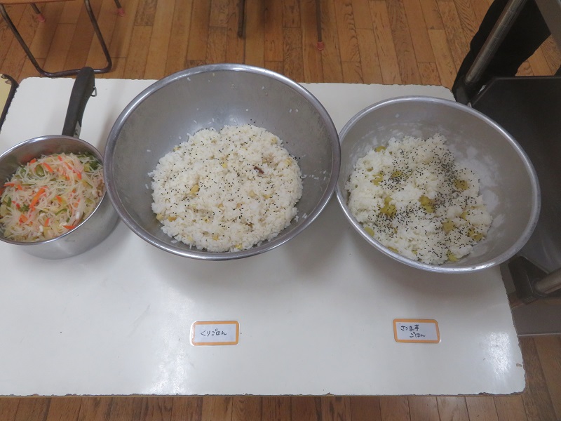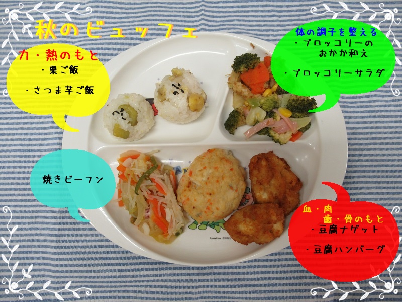 今日は秋のビュッフェの日で、幼児組では子どもたちに食べたいおかずを選んでもらいました!