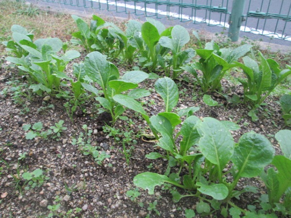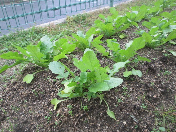 幼児クラスの畑では小松菜や大根がすくすくと育っていました。