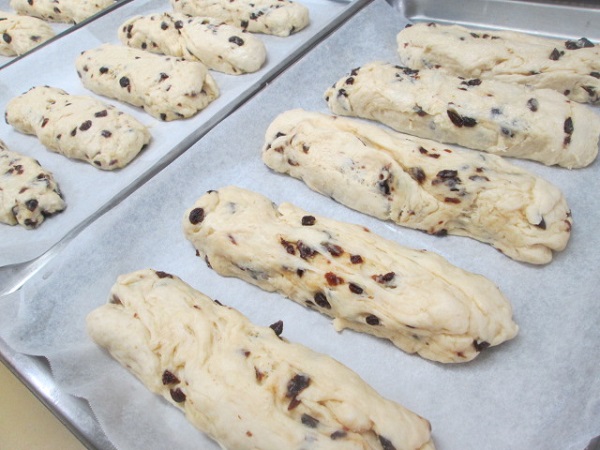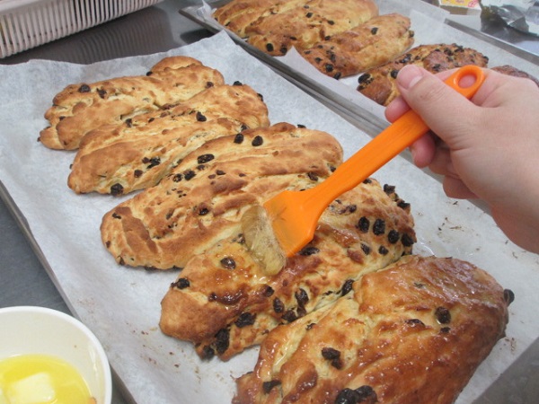 発酵させ生地の形を整えたパネトーネを調理室で焼きました。焼きあがったら溶かしバターを塗りました!生地に馴染んでしっとり!