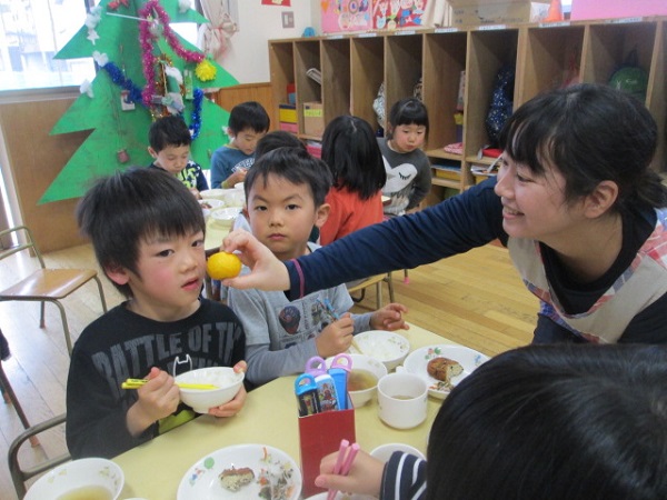 子ども達にはゆず香りを嗅いでもらいました。「いい匂い~♪」「お家にゆずあるよ!」「お風呂に入れるんだよ!」といろんなお話を聞かせてくれました。