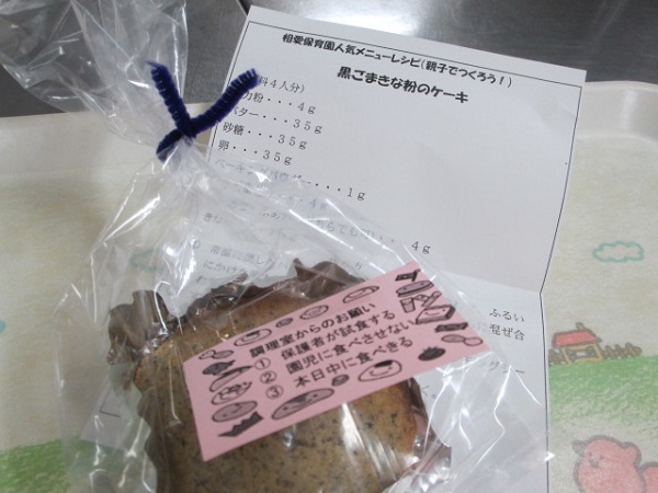 2018年02月01日 おやつの試食保育園の手作りおやつを、ご希望の保護者の方に毎月試食して頂いております。この日は「黒ごまきな粉のケーキ」でした。2月23日は「骨ほねドーナツ」を予定しております。玄関横にある申し込み用紙に記入していただき、回収ボックスにご提出下さい。お迎え時に試食とレシピをお渡し致します。