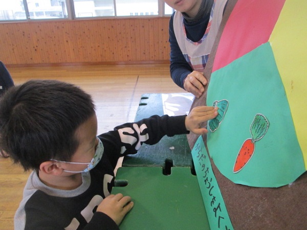 シールを貼り終わったら栄養士がチェック!「土の中に出来る野菜って他に知ってる?」と聞くと「ん・・・」と考え込む姿も見られましたが、答えが分かると元気よく「じゃが芋!」と教えてくれ、とても嬉しそうでした。