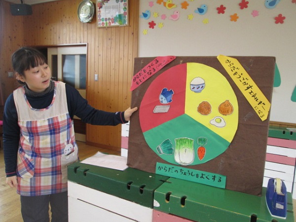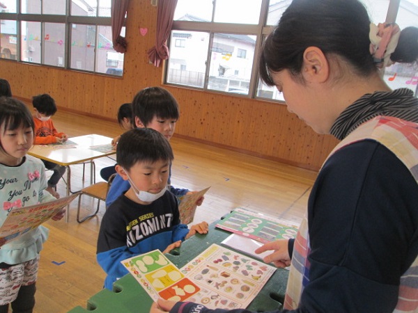 ボードに貼った食材が正しい場所に貼ってあるか、みんなで確認しました。違うグループに入っている食材は、子ども達に正しい色のグループに直してもらいました。