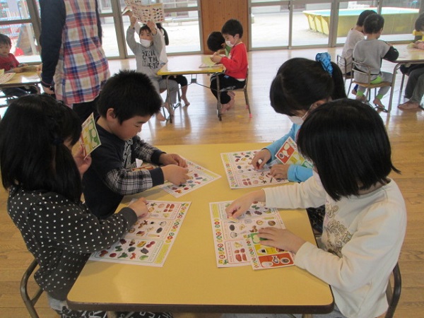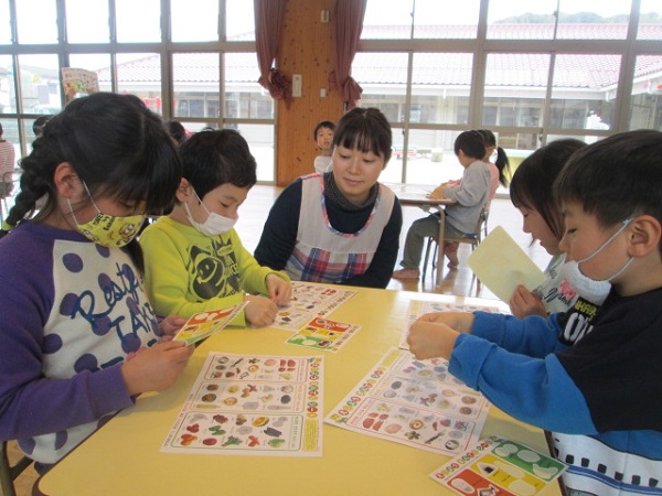 「えいようまんてんシート」や「たべもののできかたシート」を使って、食材シールを3色に分けたり、野菜のできかたを学んだりしました。