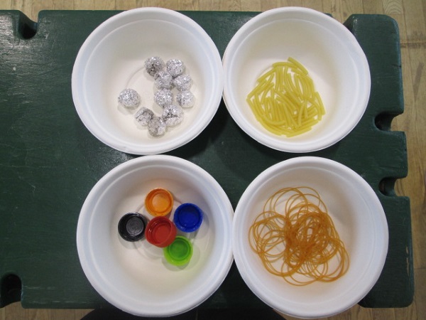 アルミボール・マカロニ・輪ゴム・ペットボトルのフタ(水に浮かべます)を箸でつかみました。一番難しいのはペットボトルのフタでしたが、「やりたい!」と、大人気でした。