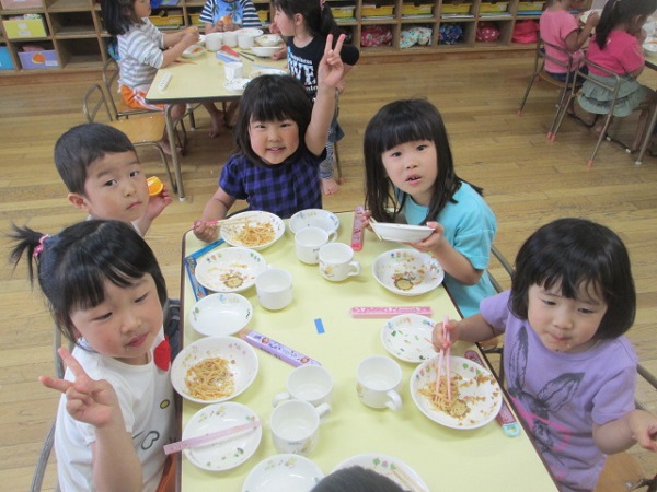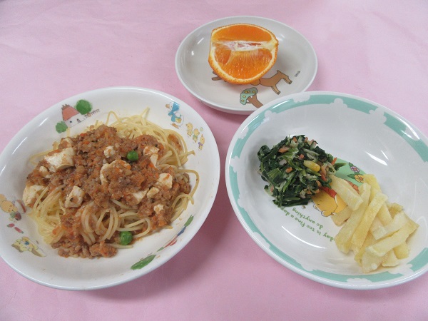2017年05月23日 5月9日の献立~献立~☆豆腐ミートスパゲティ☆フライドポテト☆ポパイサラダ☆清見オレンジ子どもたちの好きな麺の日の献立です。ミートソースには豆腐が入っているので、ボリュームもあり食べやすくなっています。