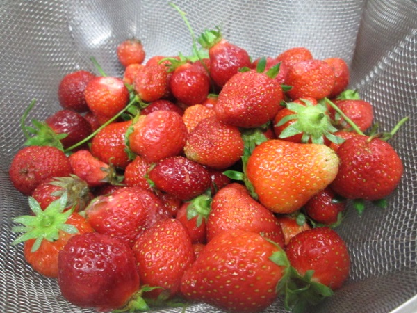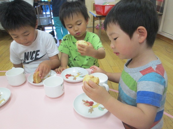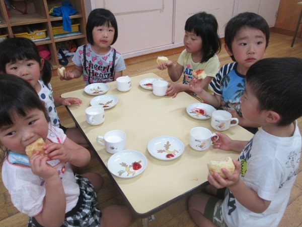 2017年05月12日 いちごとスナップエンドウを収穫しました。今日もたくさんのいちごが赤くなっていたので、採ってジャムにしました。ろけっと組さんの畑ではスナップエンドウも収穫できたので茹でて食べました。今日のおやつの「簡単メロンパン」に採れたていちごのジャムをつけて食べました!