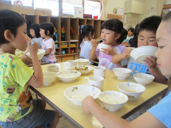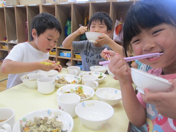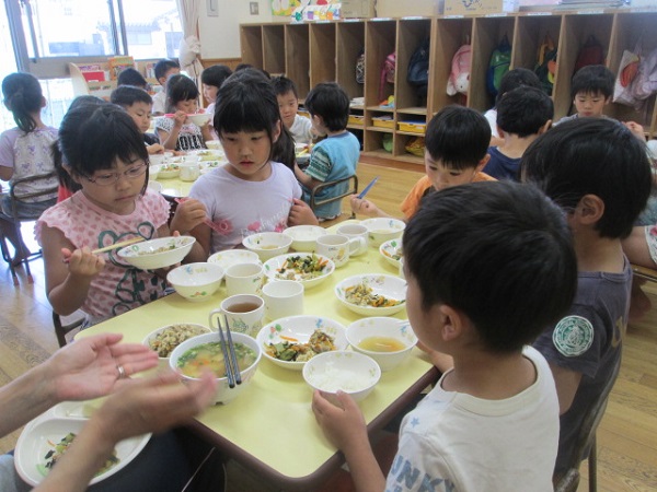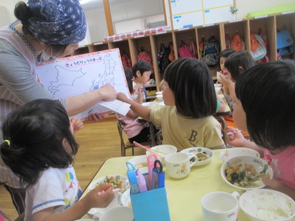2017年05月18日 東京都の郷土料理~献立~☆豚肉の柳川風煮☆小松菜の煮びたし☆ちゃんこ風スープ☆りんご東京湾ではアナゴ・マコガレイ・アサリなどが取れるため郷土料理にはアサリの深川めしや柳川煮などの料理があります。子どもたちは日本の首都でもある東京都の場所を地図で見ました。「東京知ってる~!」とたくさんお話もしてくれました。