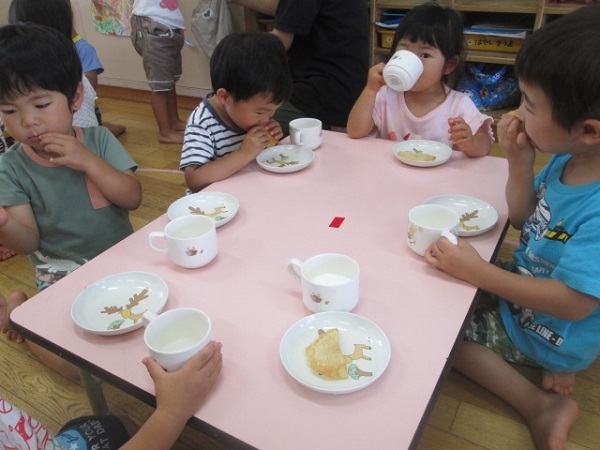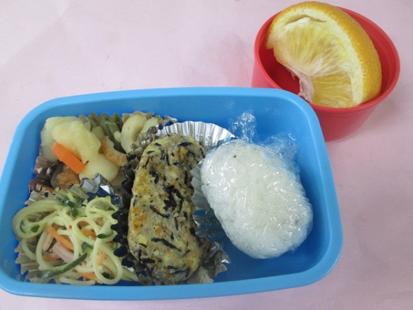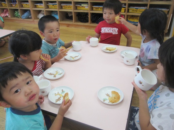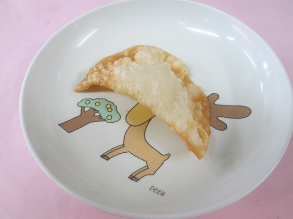 2017年06月09日 新しいおやつを紹介します!~献立(お弁当ごっこの日)~☆豆腐とツナのハンバーグ☆スパゲティサラダ☆じゃが芋の煮物☆甘夏みかん新しいおやつは「餃子アップルパイ」です。りんごと砂糖を煮た具を餃子の皮で包んで揚げたおやつです。パリパリの皮とりんごの甘酸っぱさが丁度よく好評でした!