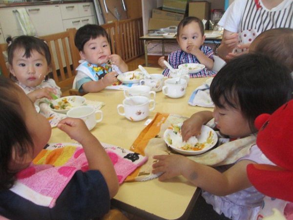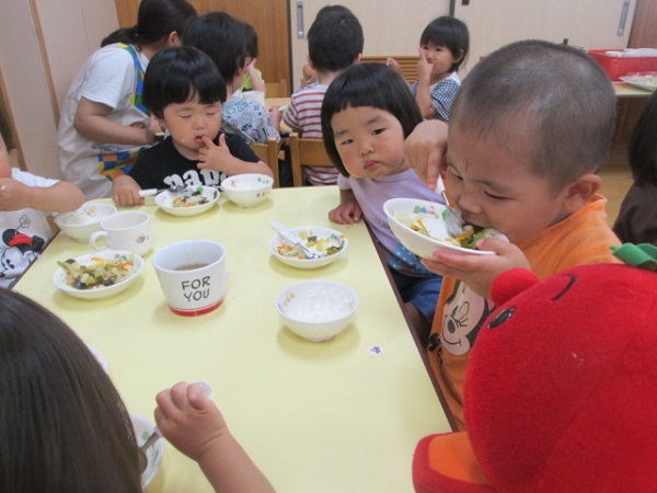 2017年06月02日 トマちゃんとモグモグしよう!~かみかみの日の献立~☆豚肉の生姜焼き☆大豆と昆布煮☆かみかみ和え☆甘夏みかん虫歯予防集会に合わせて献立も噛む力を育むために、咀嚼の必要な昆布や切干大根を取り入れました。パペット人形のトマトの「トマちゃん」と乳児クラスの子どもたちと一緒にモグモグをしました。「トマちゃんみて~!」とモグモグの様子をたくさん見せてくれました。