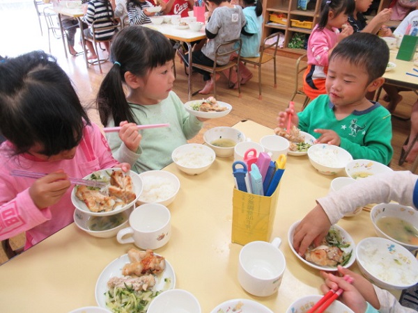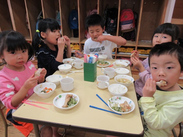 2018年11月06日 かみかみの日メニュー~献立~☆スパイシーチキン☆かみかみサラダ☆さつま芋の味噌汁☆りんごスパイシーチキンは幼児組さんには鶏手羽元、乳児には鶏もも肉を使いました。骨付き肉は食べにくい食材ですが、みんなよく噛んで食べていました。「よく噛むこと」は肥満防止や味覚の発達に効果があるだけでなく、発音が良くなる、歯並びがきれいになるなどの効果もあります。これからも「よく噛むこと」が身に付くよう、指導していきたいと思います。