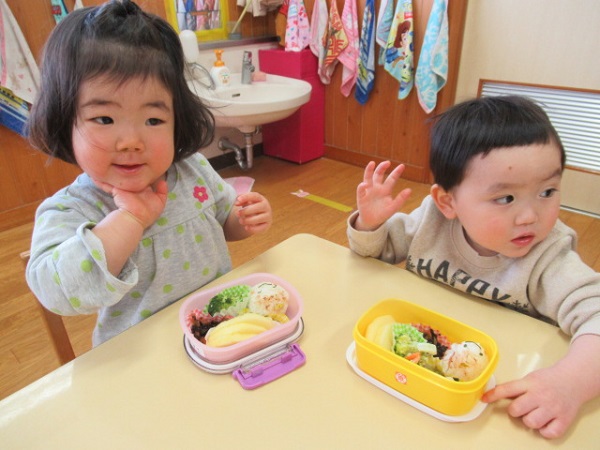 お弁当ごっこを通して、きれいに完食できた喜びや、お弁当をお友達と楽しく食べることなどを経験することは、乳児期に大切にしたい食育の一つです。