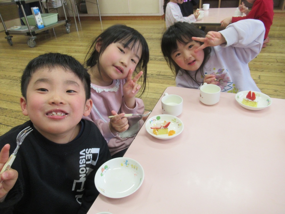 絵本に出てくるメニューNo.72(給食室) 2025年03月21日 今日のおやつは、『フルーツケーキいただきます』という絵本に出てくるフルーツケーキを食べました☆ ふわふわのケーキにホイップクリームといちごとみかん缶をのせて完成♡ 「クリームが美味しい~♡」 「もっとクリームが食べたい!」 「毎日このおやつだったらいいのになぁ~♡」と、可愛い反応がありました。