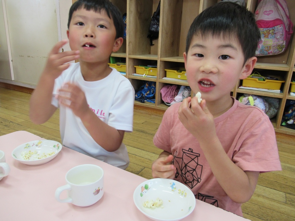 今日の絵本は『おいしそうなしろくま』に出てくる、ポップコーンを食べました!!