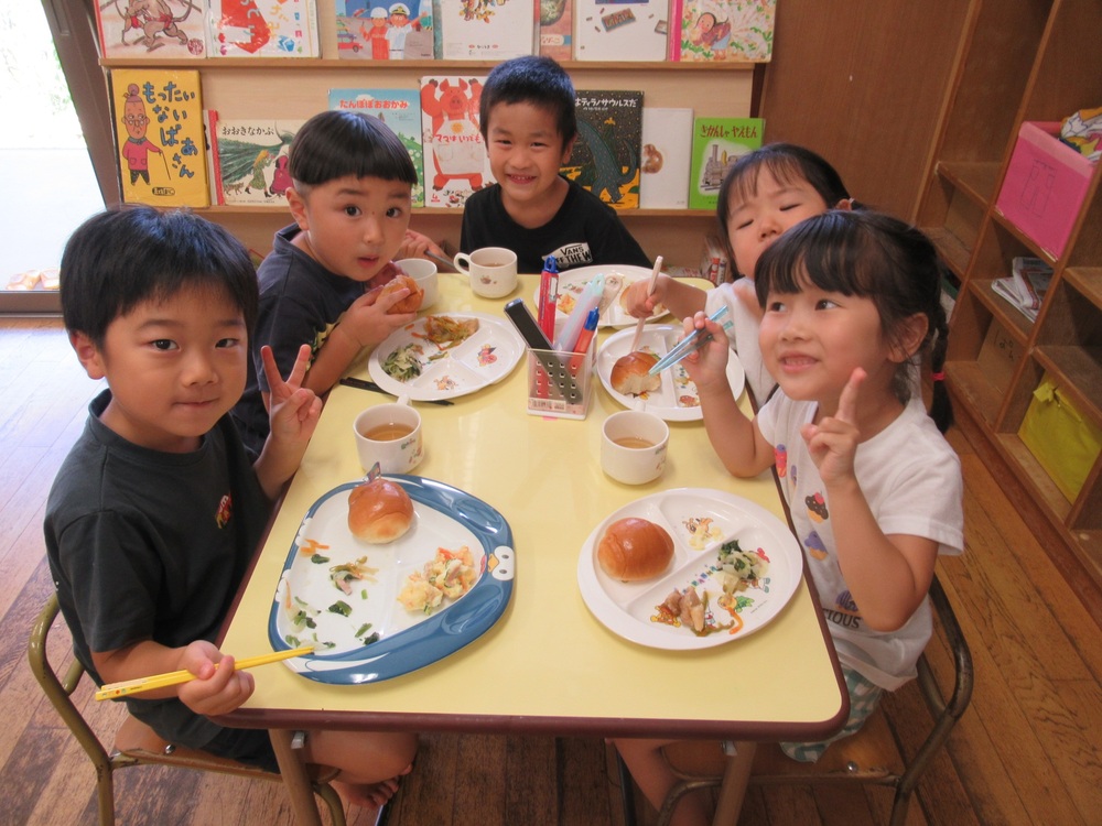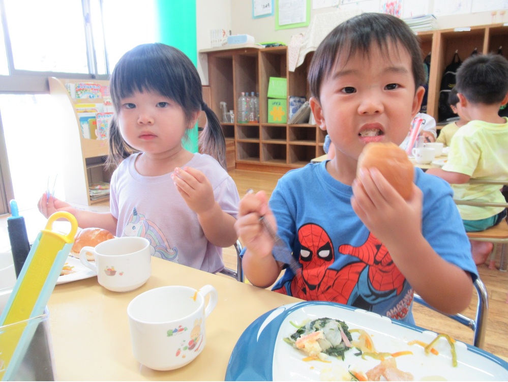 8月の誕生会メニュー⭐︎ 2023年08月29日 ♡誕生会メニュー♡ ロールパン 鶏の南蛮漬け ほうれん草のソテー ポテトサラダ りんご 誕生児デザート : スフレチーズケーキ 友だちと食べる給食ってとっても美味しいですね☆ 美味しそうにパンを頬張っていました⭐︎ どのクラスも給食を食べて笑顔がいっぱいで嬉しくなりました〜!