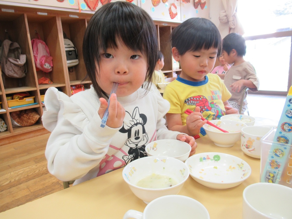 今日の給食は、「いろいろおふろはいり隊!」という絵本に出てくるシチューを食べました☆