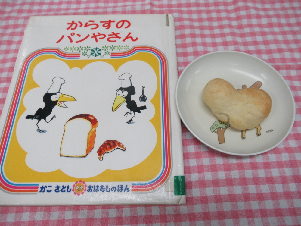 今日のおやつは、「からすのパンやさん」という絵本に出てくるパンを食べました☆