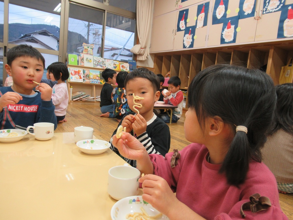 揚げぴっぴ☆ 2023年12月20日 子ども達に人気のおやつ『揚げぴっぴ』を作りませんか? 市販のゆでうどんを油で揚げるだけでできちゃいます☆ 調理員が部屋に入ると『美味しい~!』と喜んでいました☆ 写真を撮る時に、はいチーズの代わりに【揚げぴっぴ】でピースしてくれました。