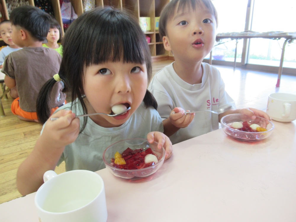 絵本に出てくるメニューNo.58(給食室) 2024年08月05日 今日のおやつは、「アッチとドッチのフルーツポンチ」という絵本に出てくるフルーツポンチを食べました☆ みかん・ぶどうゼリー・白玉だんごが入ってとてもきれいにできました♡ お団子が苦手な子もおられましたが、頑張って食べてくれましたよ! 「おだんごふたつ食べたよ~♪」と、楽しみながら食べていました。