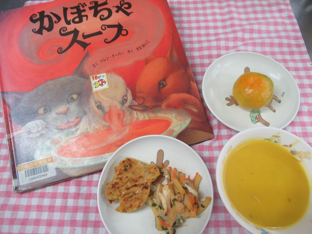 絵本に出てくるメニューNo.63(給食室) 2024年10月30日 今日は、「かぼちゃスープ」という絵本に出てくる、かぼちゃスープを作りました。 南瓜をペーストにしたので、なめらかでとても美味しく出来上がりました♪ 大人が読んでもほっこりする絵本で、イラストもとても可愛いです⭐︎ 是非、読んでみてくださいね♪ おやつには、ハロウィンクッキーを提供しました☆