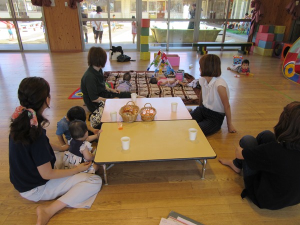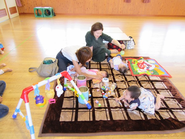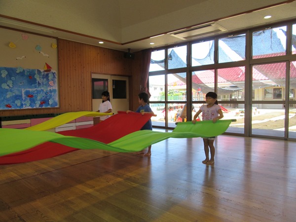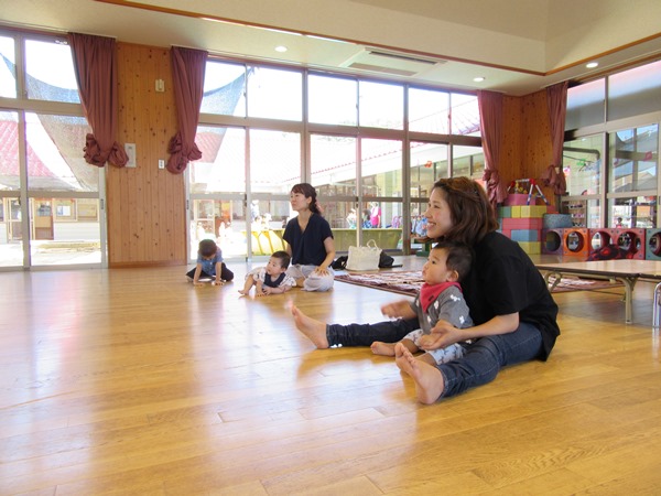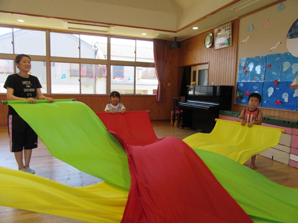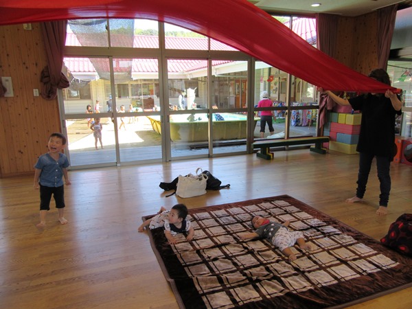 今度はお母さんたちがパラウエーブを持ち、あかちゃんたちが感覚遊びを楽しみました。