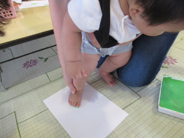 今回は「親子で楽しむ手形足形アート☆」ということで、まずは画用紙に手形、足形をとっていきます。