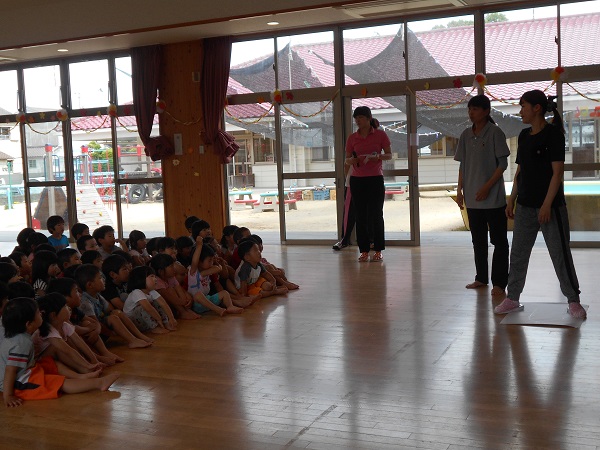 幼児組3クラスで集まり、トイレの使い方やマナーをお勉強しました。