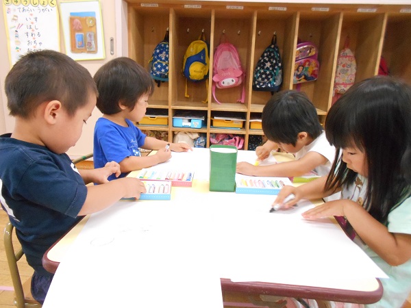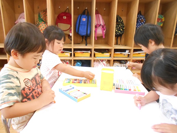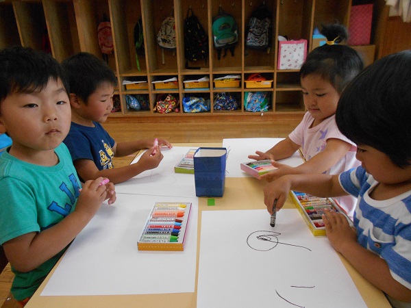 お部屋に帰ってからは、クレヨンで好きなものを自由に描きました。