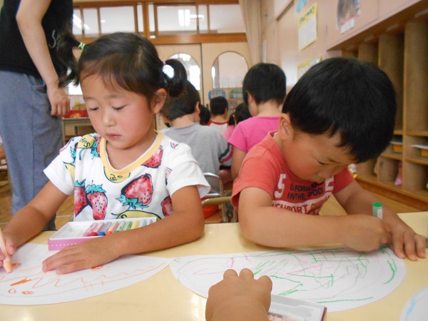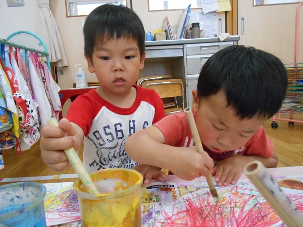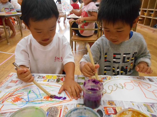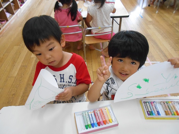 2018年05月31日 明日から6月!今日は製作で傘を作りました。説明を聞く表情のかっこよさ、素敵ですね。クレヨンでカラフルに模様を描いていきます。それぞれが好きな色、好きな模様を楽しんで書きました■最後に、絵の具を使って色を塗ります!クレヨンがはじいて面白いね☆ひとりひとり、個性が輝く素敵な作品になりました!またお部屋に飾りますので、見に来てくださいね☻