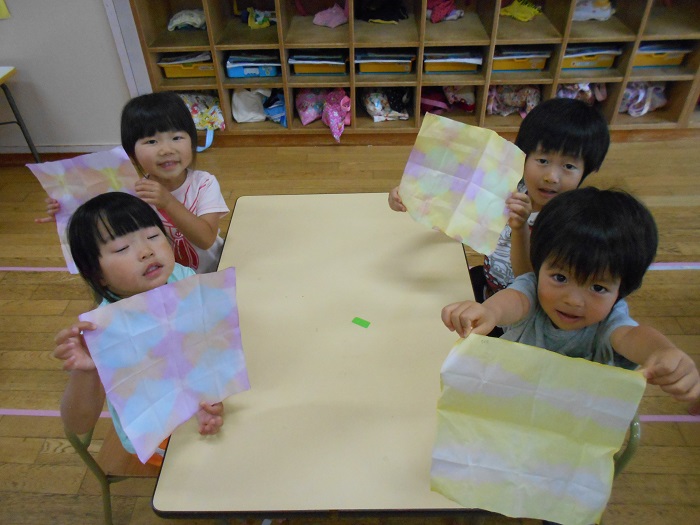 そして丸めた染め紙をそーっと開いていきますよ。