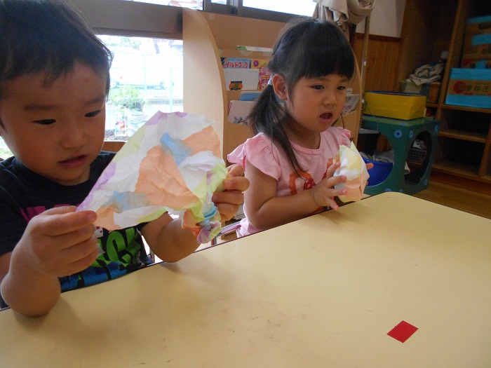 まずは染め紙を優しく丸めてクシャクシャにしていきます。