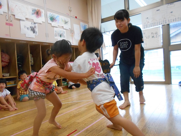 大勢のお客さんの前で相撲をとりました。