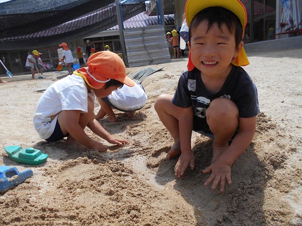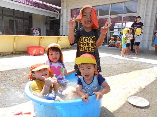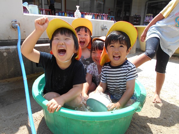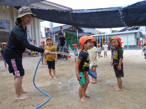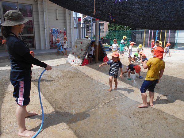 保育者がホースで水をかけると、「キャ~!!」と大喜びの子どもたち。