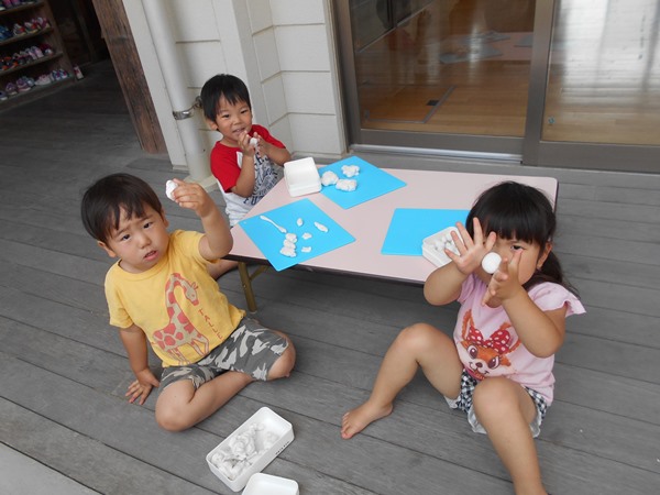 泥んこ遊びができないお友達は、粘土でお団子をたくさん作って楽しんでいましたよ。