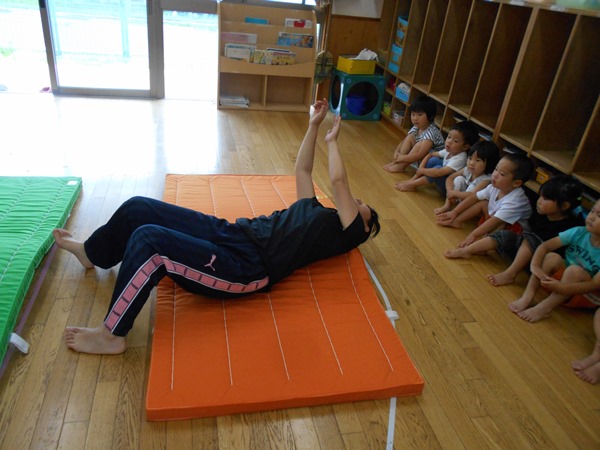 まずは、保育者がマットの上をコロコロ転がって見本を見せます!