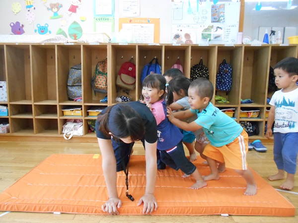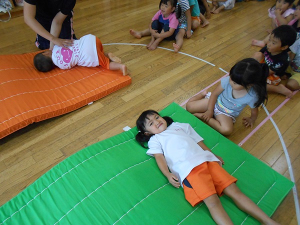 子どもたちも保育者の真似をして、マットの上をコロコロ♪
