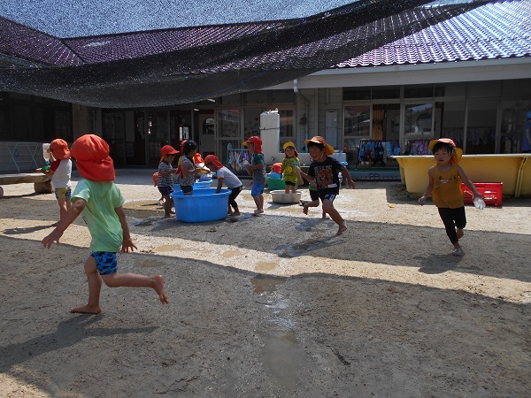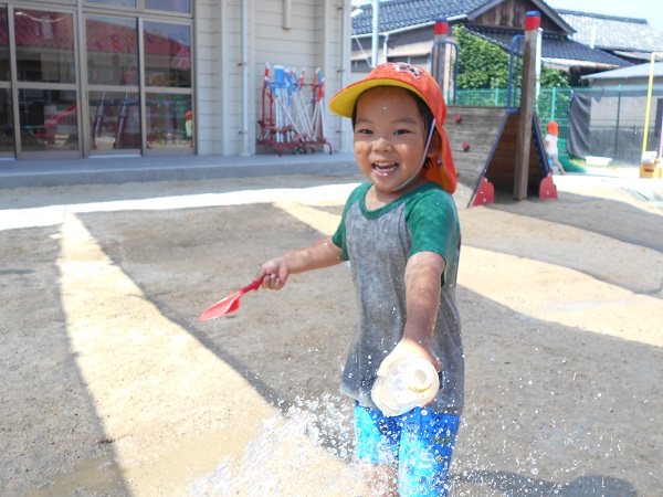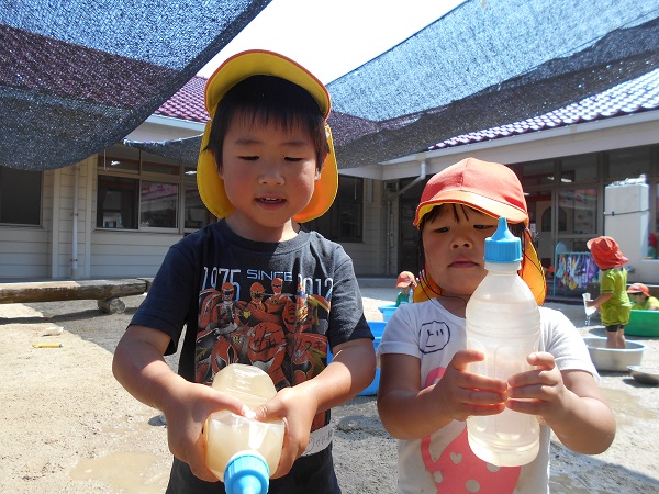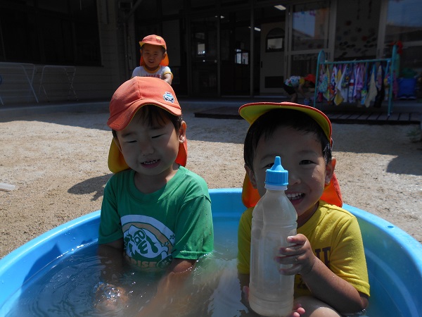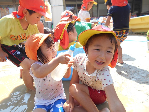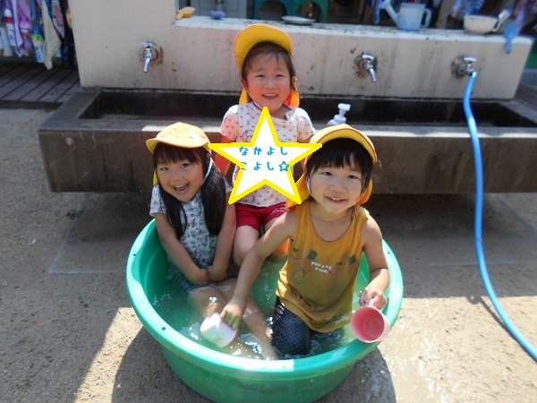 2018年06月25日 あぁ気持ちいい☆泥んこ遊びで大盛り上がり!タライに入っちゃって、ニッコリ♡「先生、水ちょうだ~い!」冷たくって気持ちがいいなぁ■お友達と一緒に水鉄砲!お揃いで楽しいな☆「お水かけてあげる♡」「きゃ~!冷たくて気持ちいい~!」水たまりの上を思い切り走って追いかけっこも最高!!お日様の下で元気いっぱい遊んだばす組さんでした■