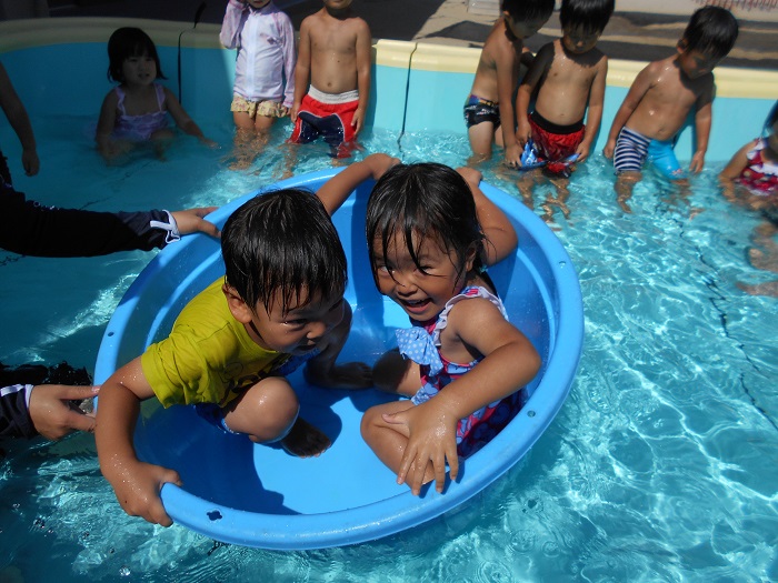 たらいの船に乗って遊びました!